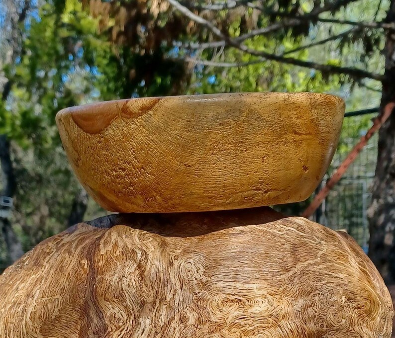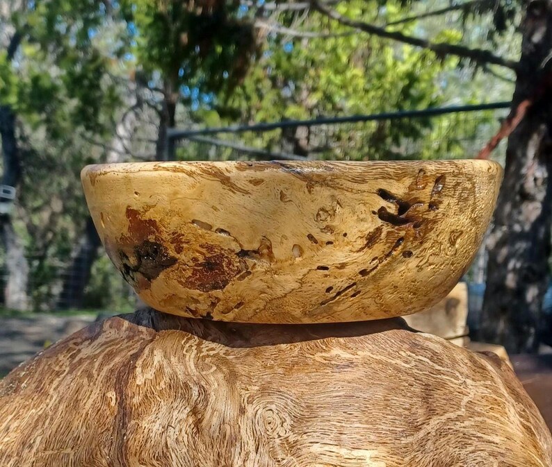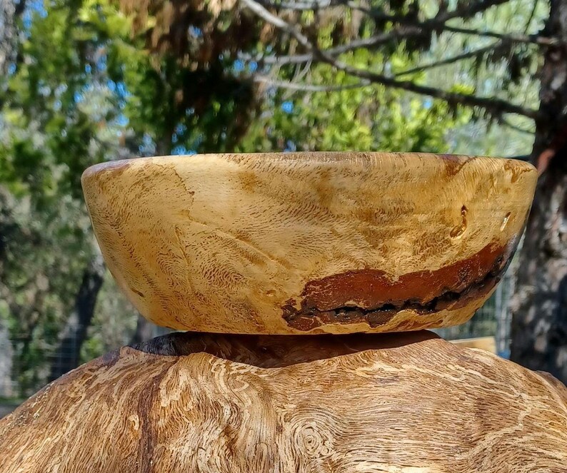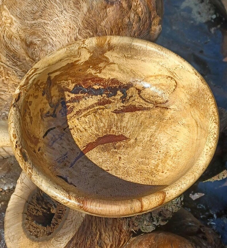 This is a one-of-a-kind spaulted white oak burl bowl. It is hand carved and hand finished. 9 inches wide and 3 inches high.